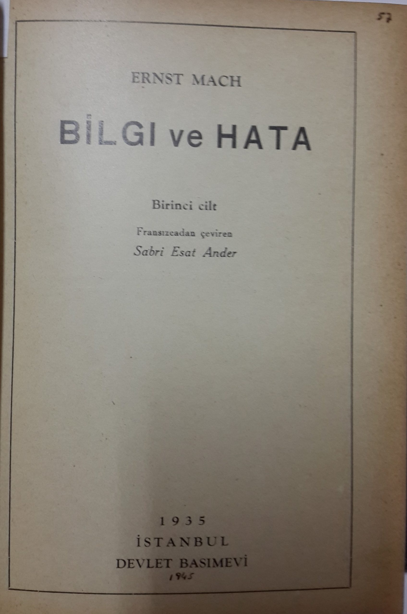 2* Bilgi ve Hata, Birinci Cilt, Ernst Mach, Sabri Esat Ander, İstanbul, 1935, Devlet Basımevi, 144+1 S.