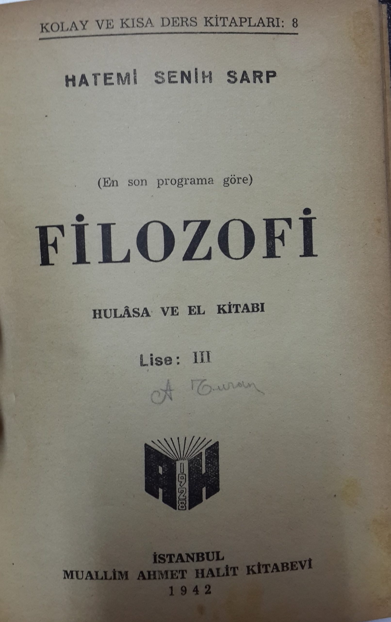 8* Filozofi Hülasa ve El Kitabı, Hatemi Senih Sarp, İstanbul, 1942, Muallim Ahmet Halit Kitabevi, 48 S.