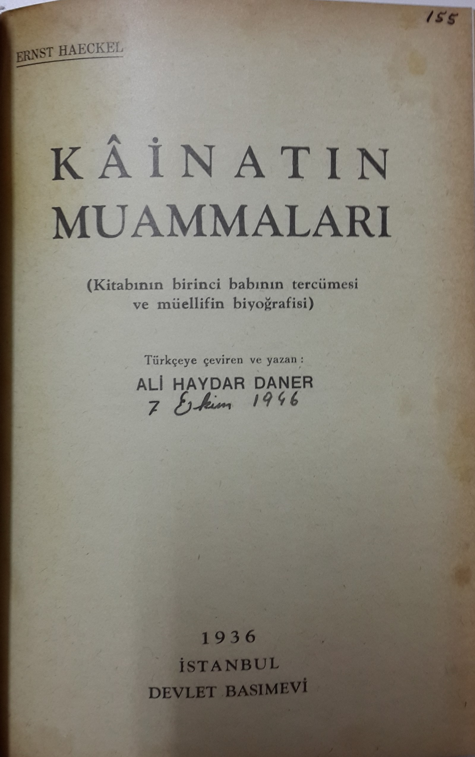 5*Kainatın Muammaları, Ernst Haeckel, Ali Haydar Daner, İstanbul, 1936, Devlet Basımevi, 40 S