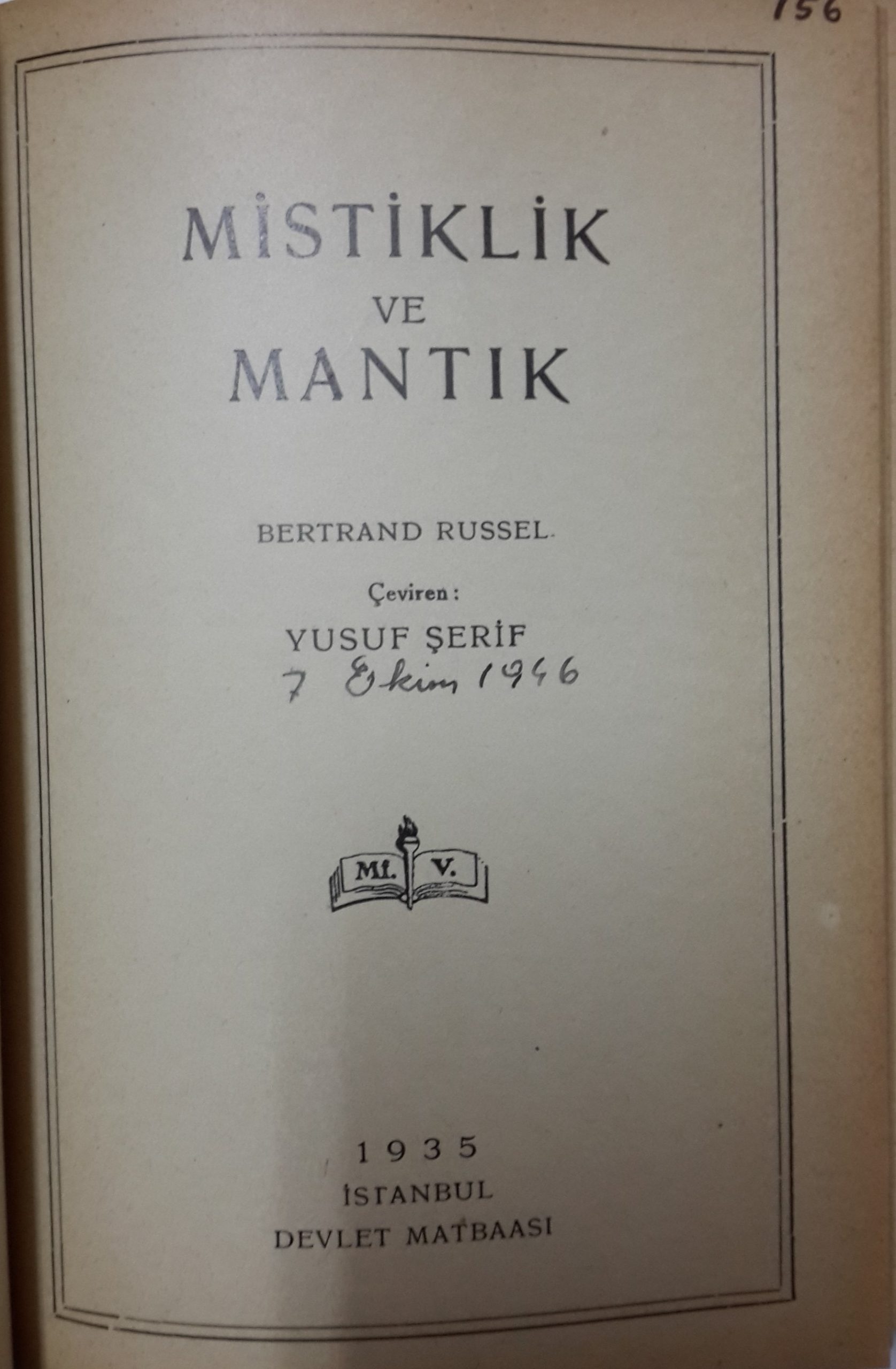 4* Mistiklik ve Mantık, Bertrand Russel, Yusuf Şerif, İstanbul, 1935, Devlet Matbaası, 55 S.