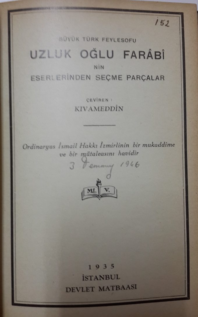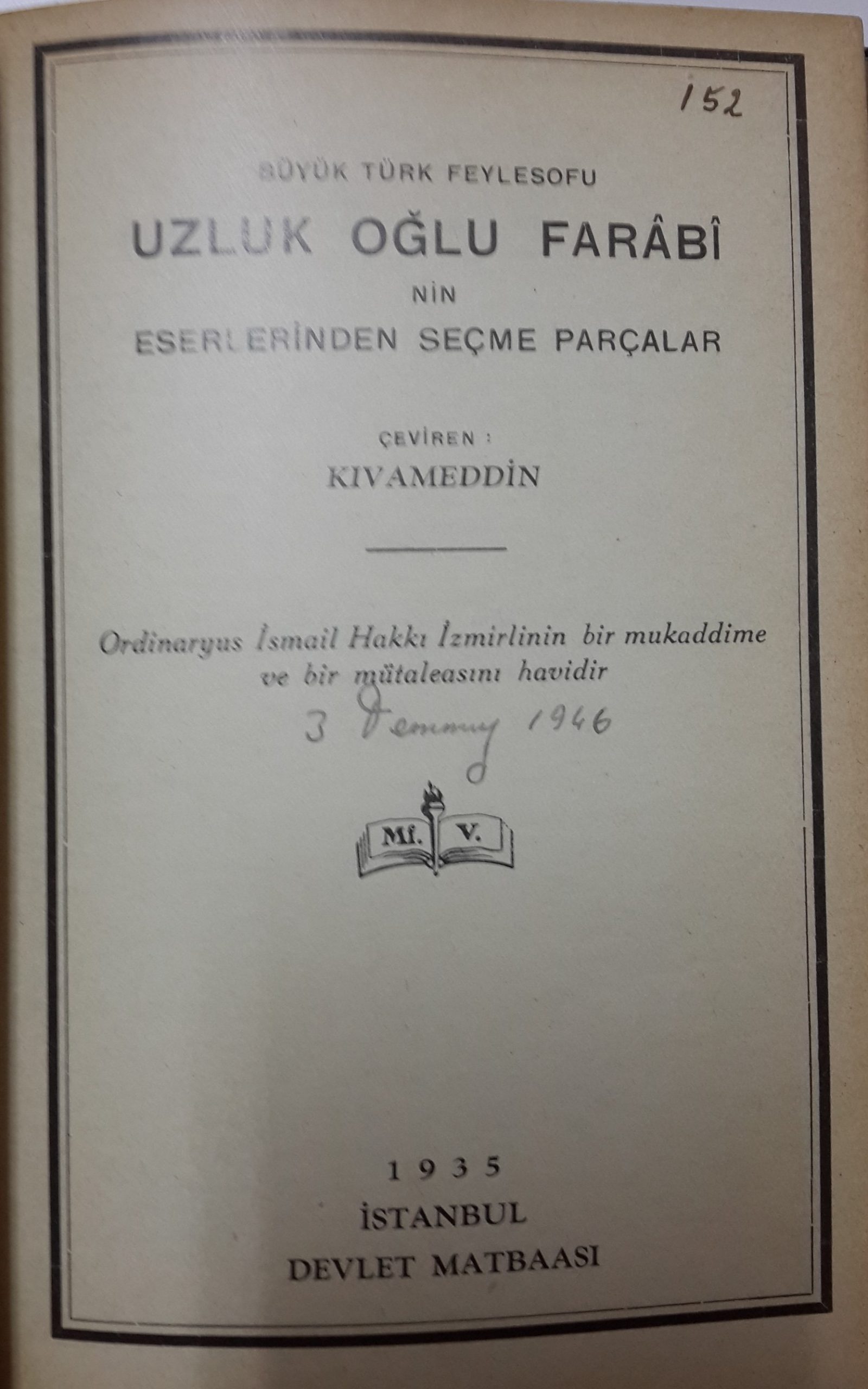 3* Büyük Türk Feylesofu Uzluk Oğlu Farabi’nin Eserlerinden Seçme Parçalar, Çev:Kıvameddin, İstanbul, 1935, 85+2