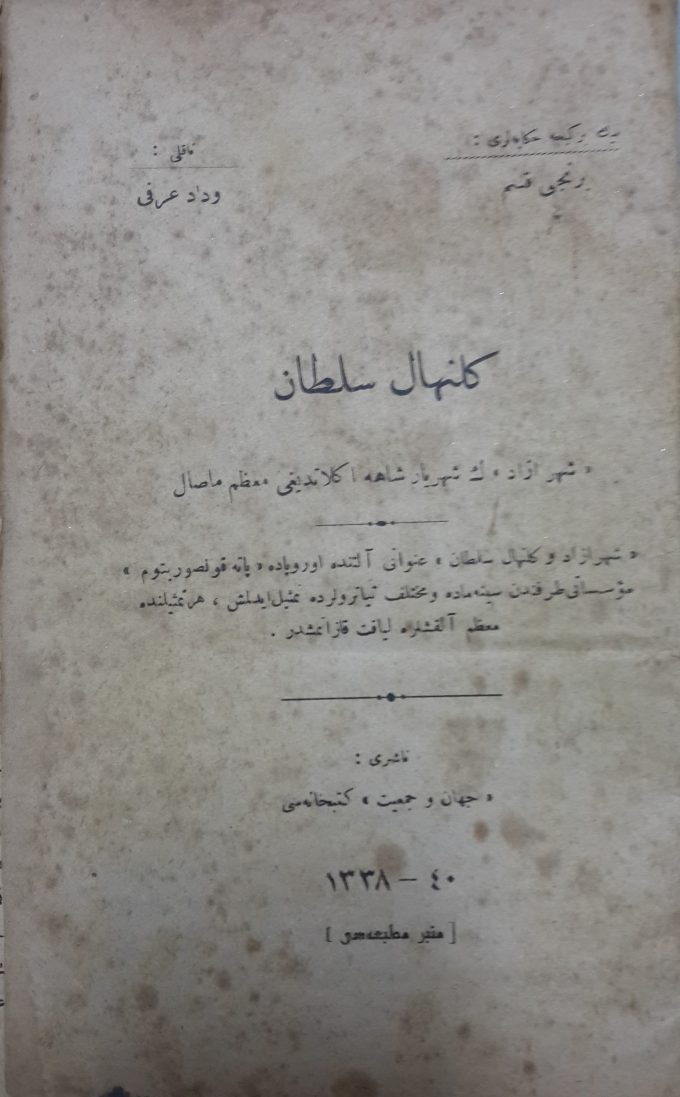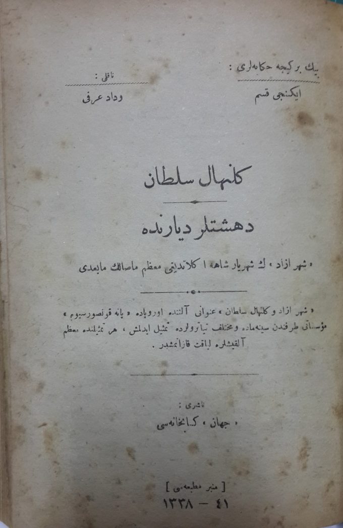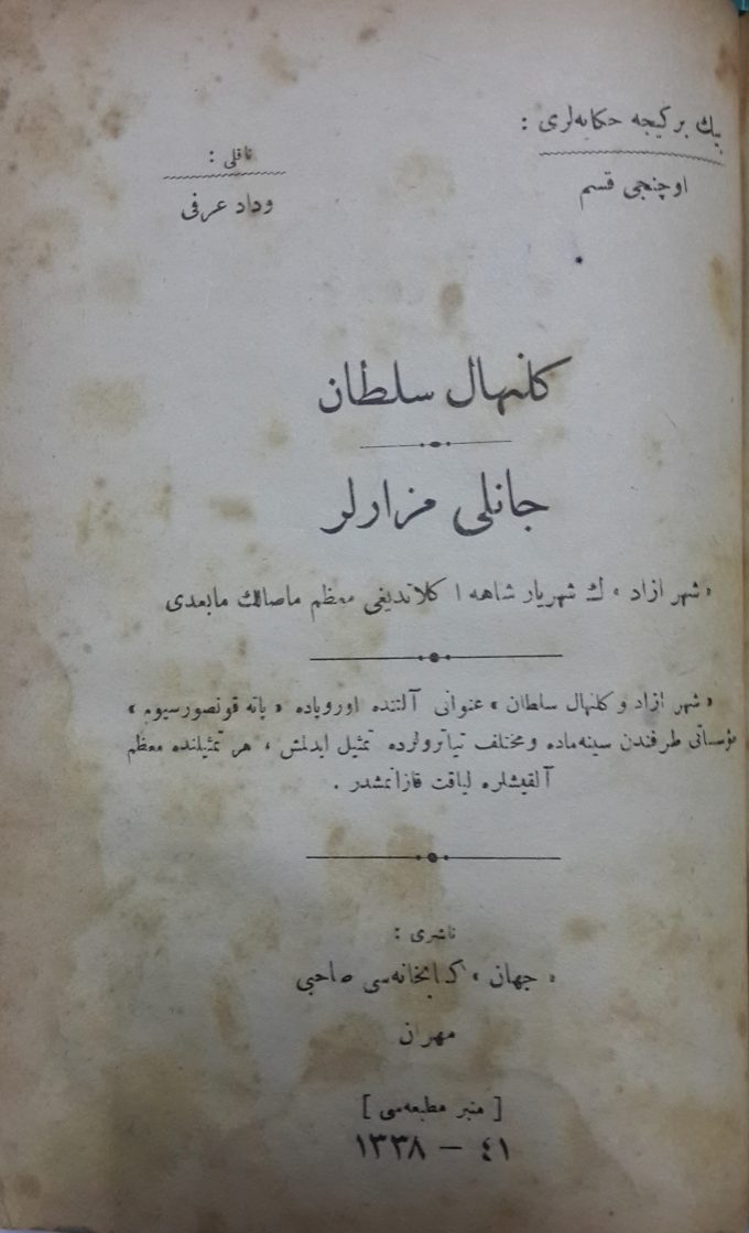 1. Kısım : Gülnihal Sultan; Şehrazat’ın Şehriyar Şaha anlattığı muazzam masal. 144 Sayfa 1338/1340 Cihan ve Cemiyet Kütüphanesi, İstanbul ÖZEGE 6413