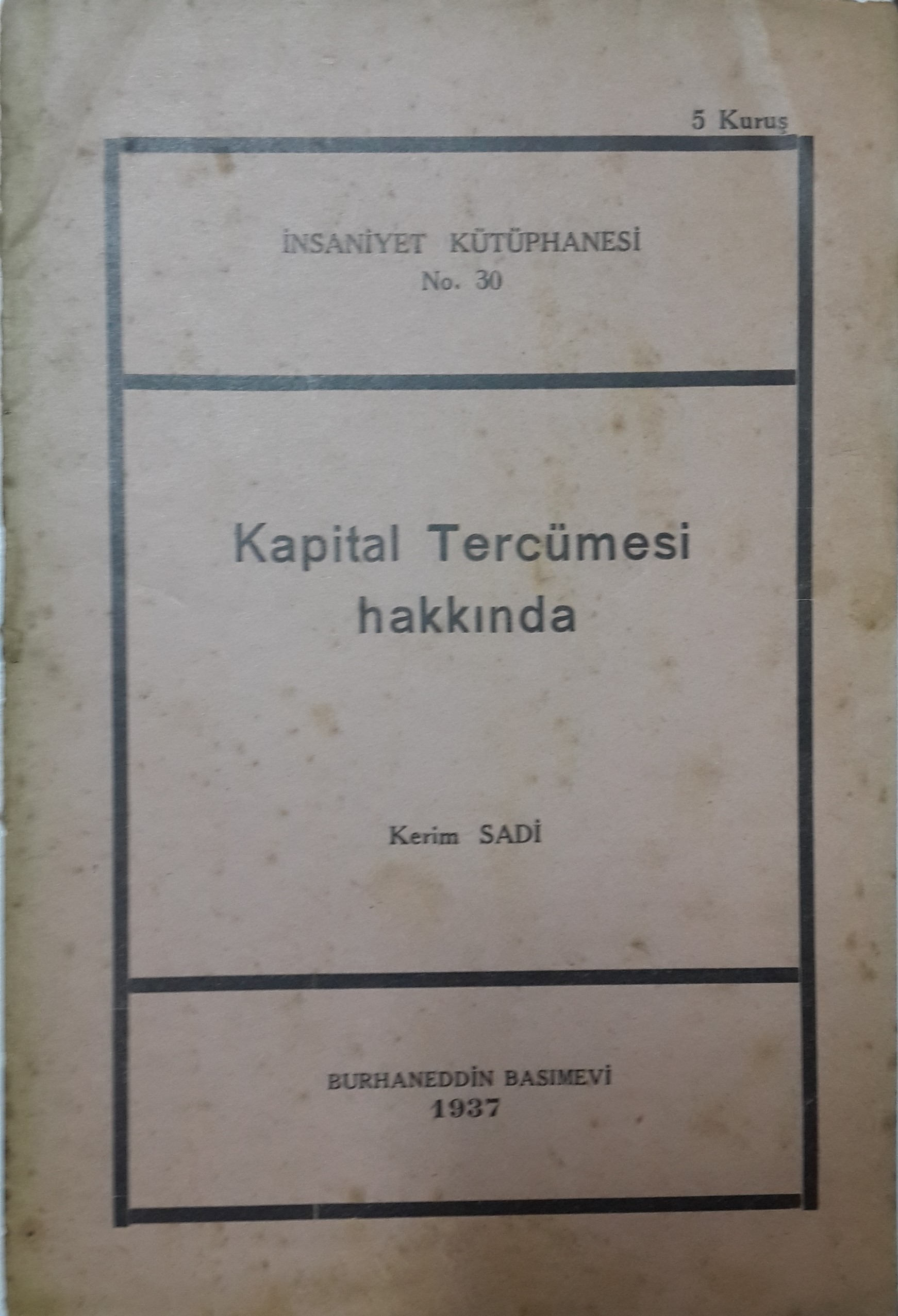 Evet, Türkçede henüz bir kapital tercümesi verilemedi. Çünkü bu iş için, ya marksizm sahasında salahiyettar bir otorite olan kuvvetli bir mütercim veya ideal sahibi materyalistlerden mürekkep bir ihtisas heyeti lazım. Şimdiye kadar bunlar ortaya çıkamamıştı ve “Kapital” in Türkiye’deki hazin sergüzeşti bitmemiş olacak ki, bu sefer de, yabancı dil bilmediği ve marksizmin mebadisini bile anlamadığı sabit olan bir mütercim – Hikmet Kıvılcımlı- “medeni cesareti takdire değen Emekçi Kütüphanesi” nin himmetiyle, ayda battal hacimde birer forma vererek (Yani bütün kapitali aşağı yukarı 30 yılda tamamlamayı vaid ederek) devasa eseri neşre girişiyor.
