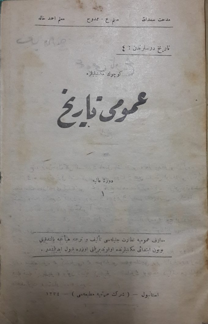 1- KÜÇÜK MEKTEPLİLERE UMUMİ TARİH İlkmektep Devre-i Aliye 1 Midhat Sadullah Sander, Abdurrauf Memduh, Ahmet Halid Yaşaroğlu İstanbul, Şirket-i Mürettibiye Matbaası 1334 (1918) 77 sayfa ÖZEGE 11437