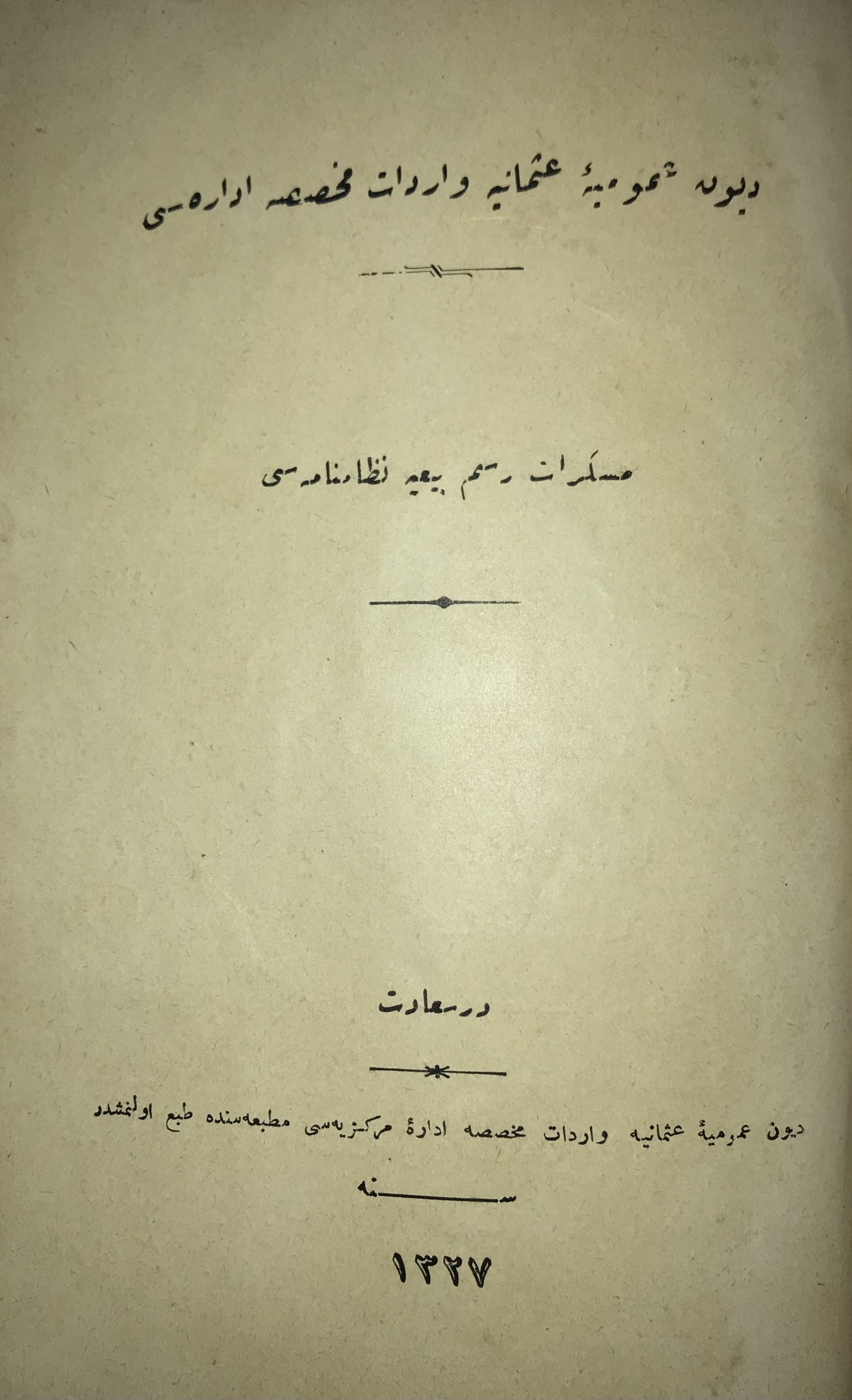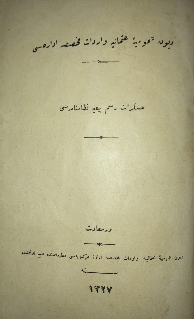 | Yayınevi | Düyun-u Umumiye-i Osmaniye Varidat-ı Muhassasa İdare-i Merkeziyesi Matbaası, Evkaf-ı İslamiye Matbaası, Şems Matbaası |