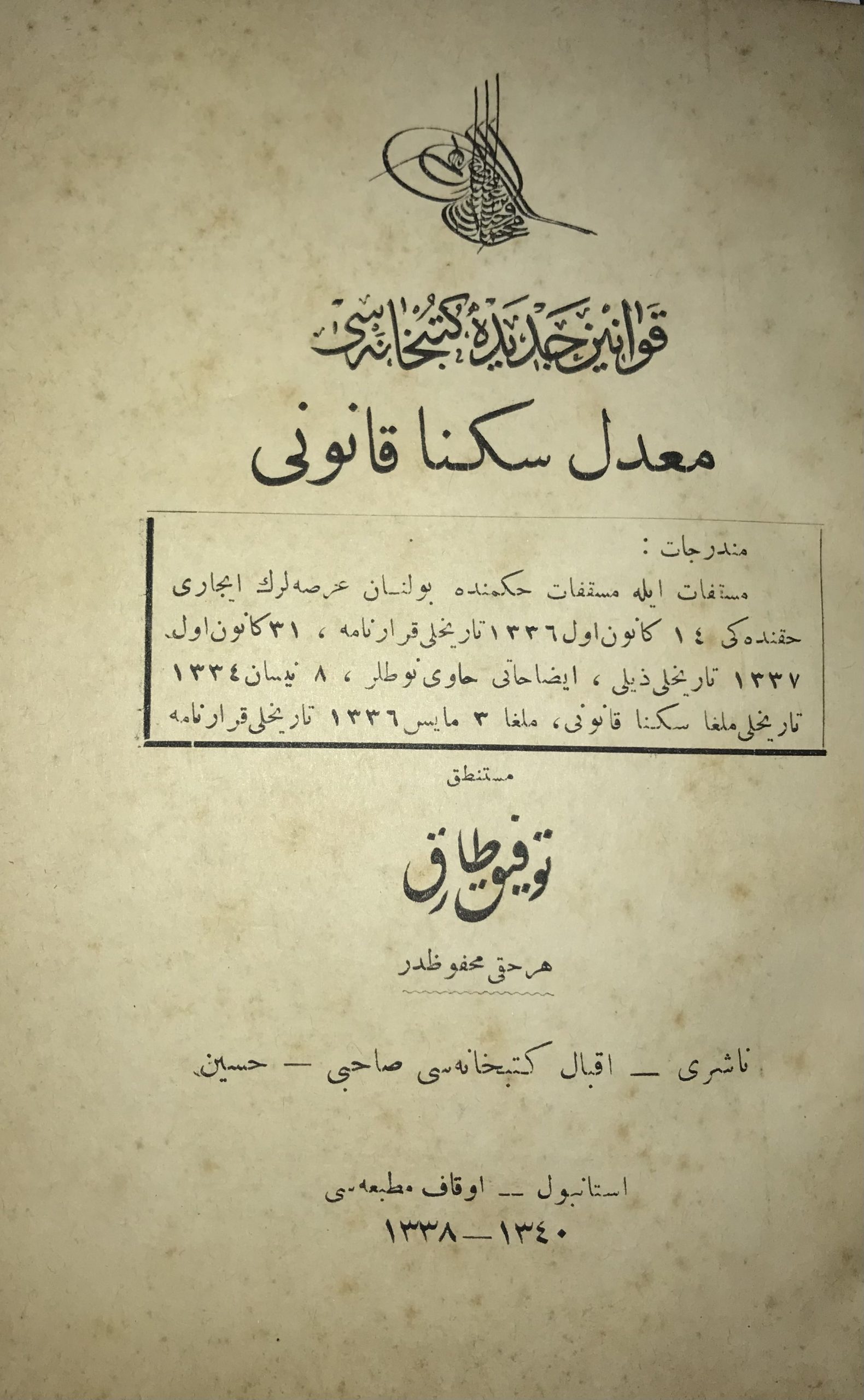 1- MUADDEL SÜKNA KANUNU İst. Evkaf-ı İslamiyye Matbaası 1338/40 (1922) 32 S. 13875