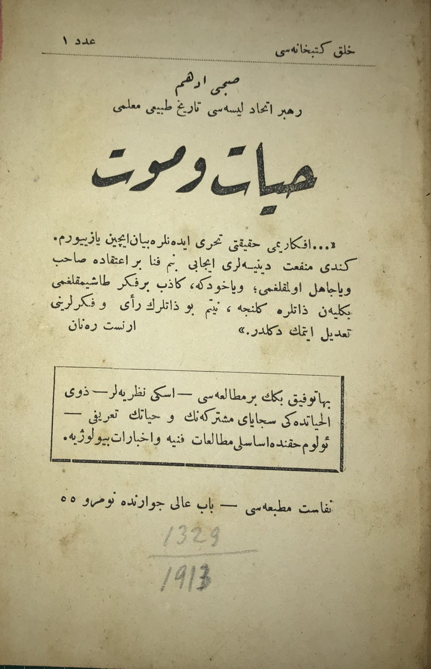 2- İNSANIN MENŞEİ Nesi-i Beşer : Ernest Haeckel Çev: Ahmed Nebil İst. Matbaa-i Nefaset 1327(1911) 92 S. 9221