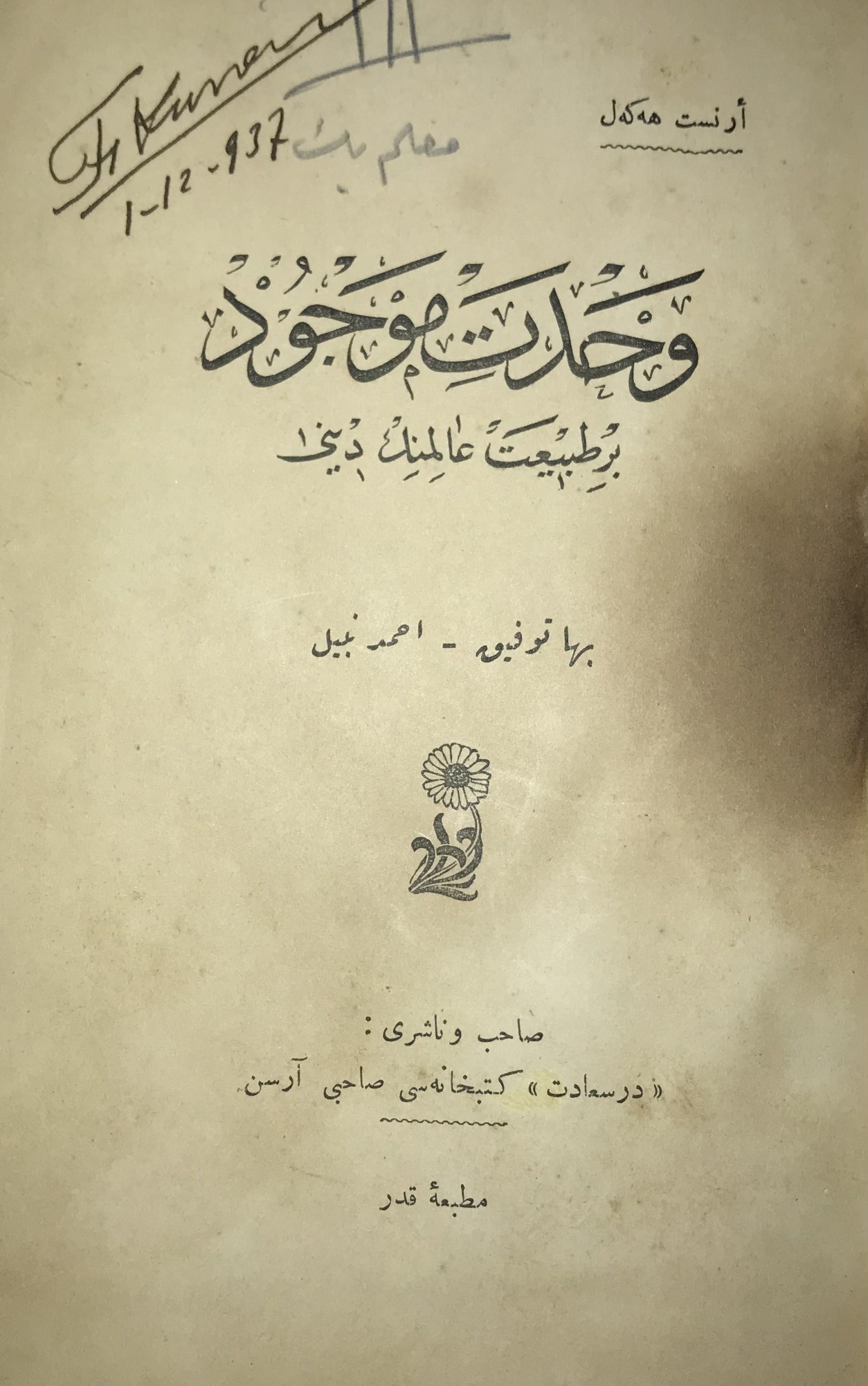 Din ve Tasavvuf, Felsefe, Sağlık1- VAHDET-İ MEVCUT Bir Tabiat Aliminin Dini : Ernest Haeckel Çev: Baha Tevfik-Ahmed Nebil İst. Kader Matbaası 88 S. 22455